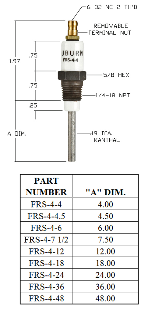 USED IN A WIDE VARIETY OF MAXON INDUSTRIAL HEATING APPLICATIONS WHERE ACCURATE FLAME SENSING IS A MUST. SOLD IN FIVE STANDARD LENGTHS. 4, 6, 7 1/2, 12, 18 & 24″ LONG NICROME ROD LENGTHS.